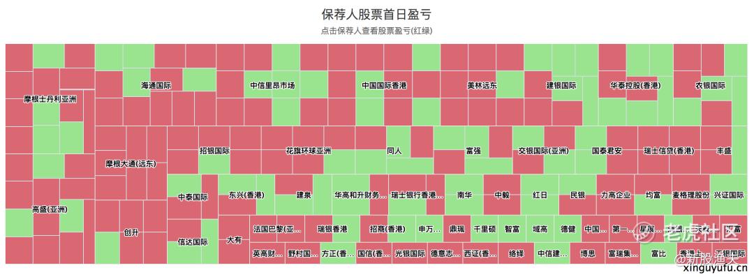 下图展示保荐人首日盈亏,点击具体保荐人可以看出该分类下涨跌股票,红色收涨,绿色收跌。
