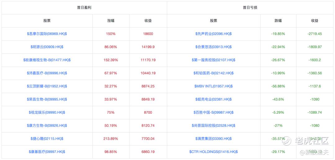 首日最大涨跌幅、盈利亏损(不计手续费)TOP10。点击股票名称查看详细信息,配售结果及中签率曲线。