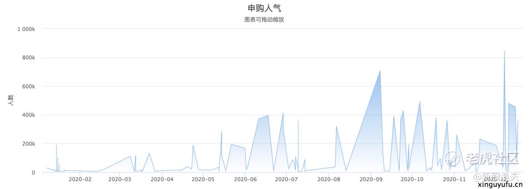 下图为新股申购人气图,新股 京东健康 于12月08日上市,申购人数高达846209 人,下半年申购人数明显上升。