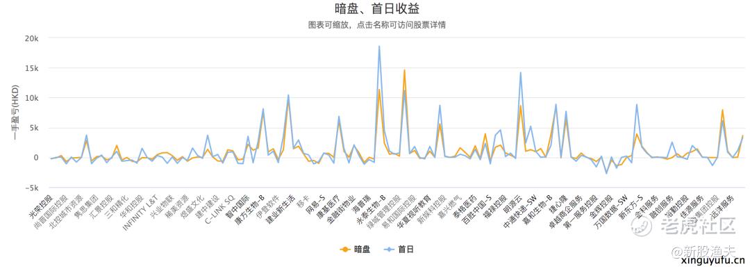 下图按照股票上市时间,分别展示中签一手,暗盘或首日收盘卖出收益。股票数量略多,图表横轴方向可缩放,点击股票名称查看更多信息。