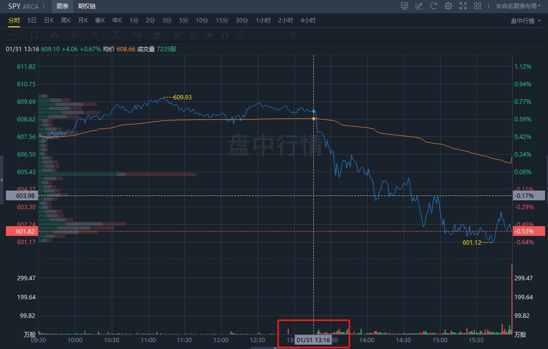 ②交易逻辑:我认为SPY当天有可能跌破599,但是不会跌破598。