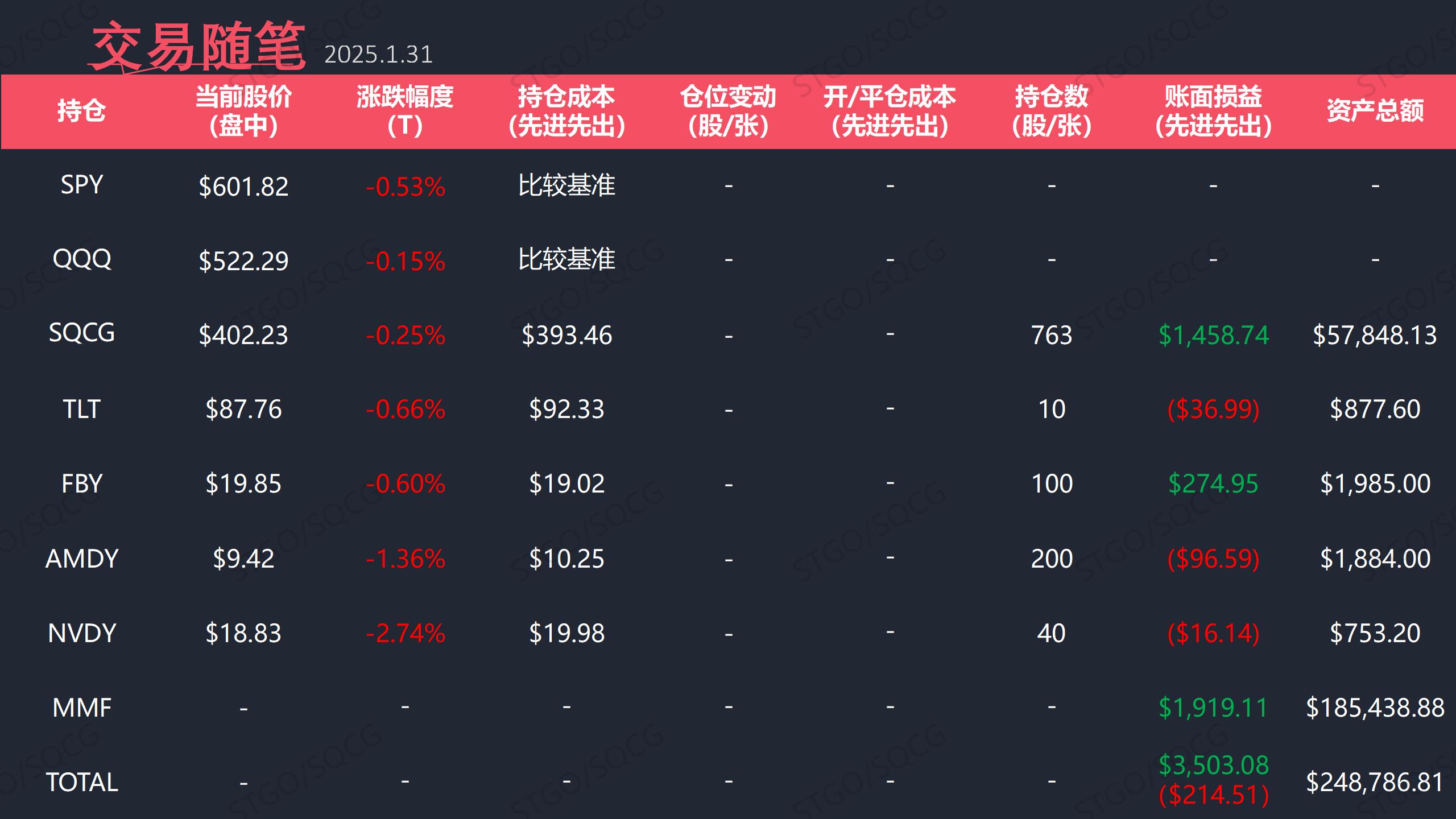 1、SPY/QQQ宽幅震荡收跌,SQCG-0.25%,表现优于大盘不少,SQCG的防守性得以比较好的体现。昨天,大盘就在距离历史新高咫尺之遥时,突然转头向下,出现经典的多空双杀,而且是股债双杀的情况。目前,我能找到的主要影响因素就是,白宫发言人确认将于2月1日起向加拿大和墨西哥商品征税25%。市场对于通胀的担忧重启。面对及其不稳定的市场,相信大家都有点不知所措,好在我们SQCG策略还算稳健,利润回档幅度非常有限。