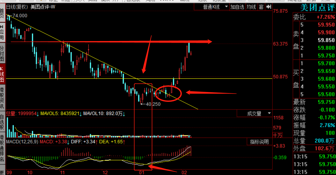 同样的,还有$美团点评-W(03690)$ :竖框,就是MACD买点,最好的买点或者是确认加仓点是“红圈”突破承压线那个位置,因为美团散户比小米少,所以突破水平黄线后,一波直接干上去了,昨天就是压力位