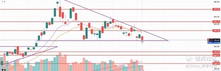 $特斯拉(TSLA)$ tsla三角整理下边缘是375,如果今天(2月6日)收盘不能站稳375,就破位了,可能就奔着340(有个筹码峰)去了。