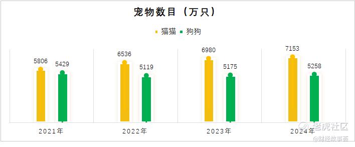 而在整体狂飙的大势中,猫狗的数量增长并不同步:猫猫的增速远快于狗狗。