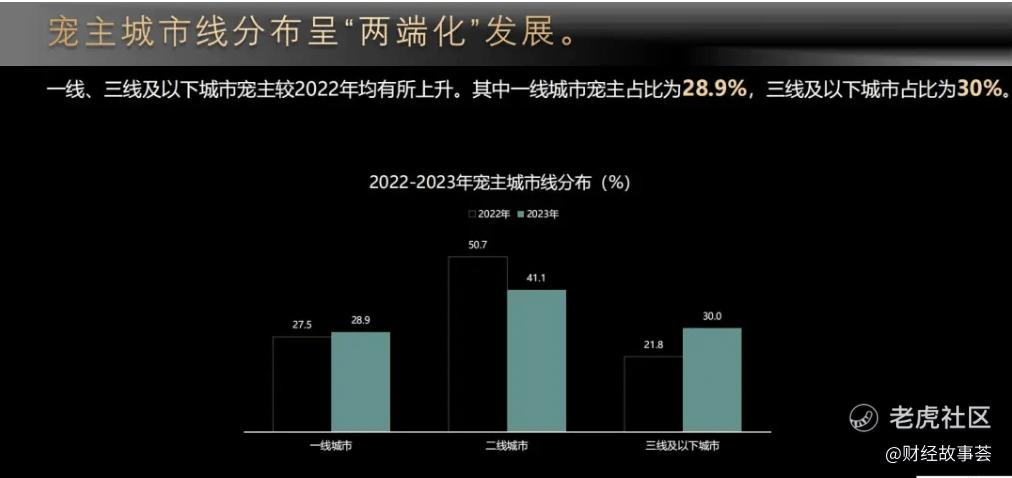 根据《2023年-2024中国宠物行业白皮书》,2022年—2023年,三线及以下城市的宠主占比从21.8%扩大到30%,大幅提升8.2个百分点。相较之下,一线城市宠主的占比仅提升1.4个百分点,二线城市宠主占比则缩小了近10个百分点。