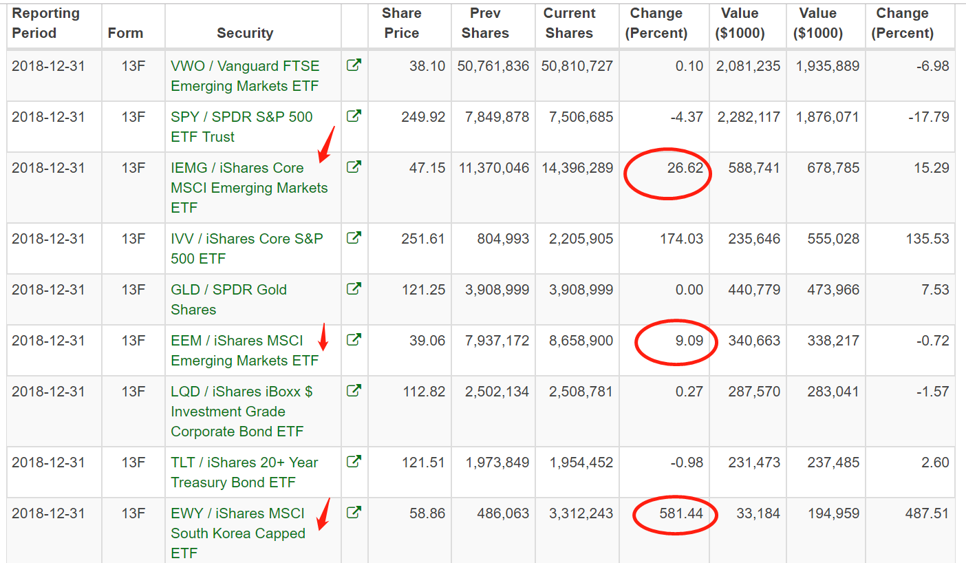 13F显示,桥水四季度强势加仓IEMG和EEM两个新兴市场ETF。同时,其还将MSCI韩国ETF(EWY)的持仓从48万股猛增至330万股!