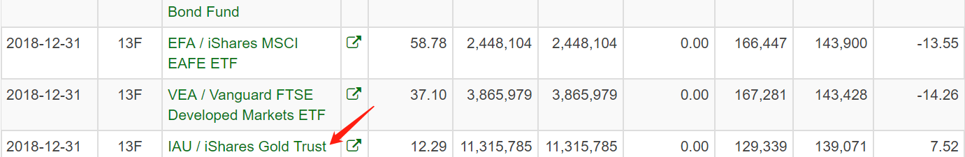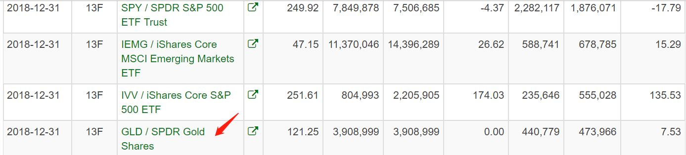13F监管文件显示,全球最大对冲基金桥水基金四季度继续持有SPDR Gold Shares,持仓规模达到390万股。此外,桥水还持有全球第二大黄金ETF iShares Gold Trust,持仓规模为1130万股。