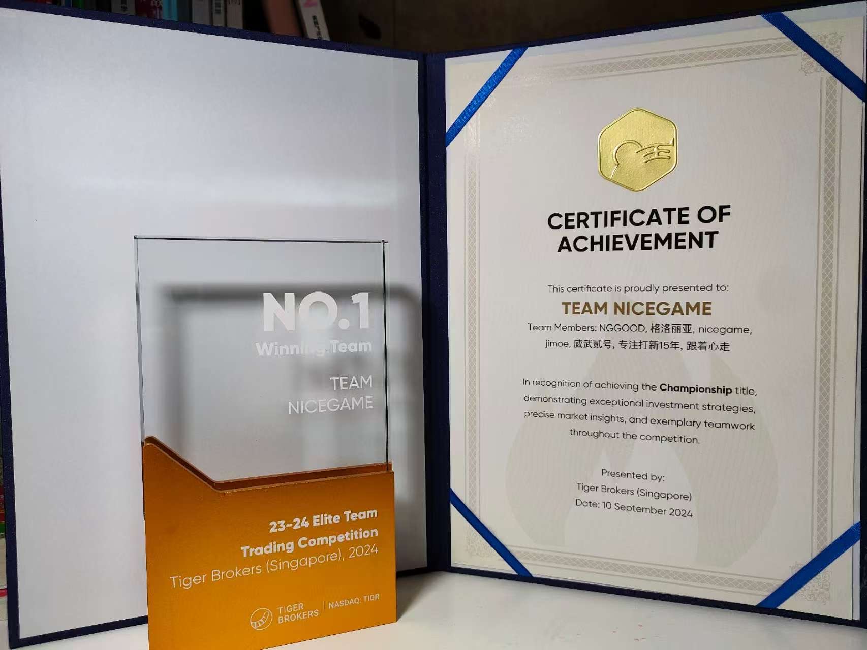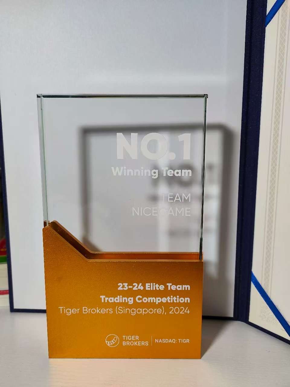 经过一年的拼搏与努力,老虎证券 23-24 Elite Team实盘赛冠军的奖杯终于送达!这不仅是一座奖杯,更是对所有获奖团队成员卓越贡献的肯定。