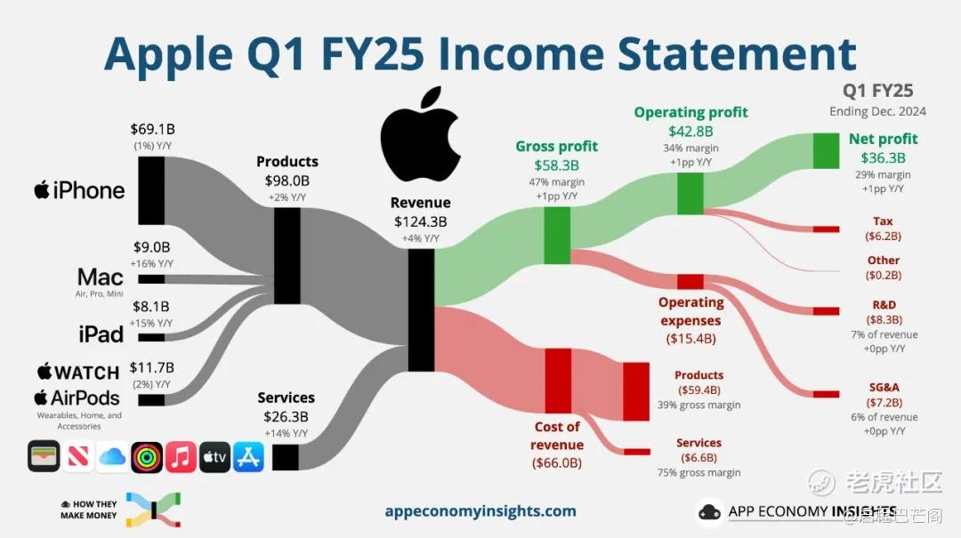 苹果四季度营收1243亿美元,同比增长约4%,也是历史最高的季度营收;净利润363.3亿美元,同比增长7.1%,双双超出预期。虽然苹果近几年增速较慢,但是出现了结构上的新变化,这次财报中: