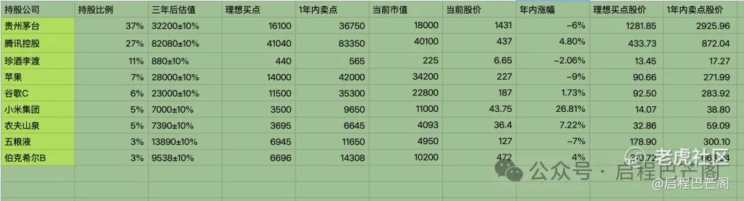 目前十大持仓:贵州茅台37%,腾讯25%,珍酒李渡11%,苹果7%,谷歌6%,小米集团5%,农夫山泉5%,五粮液3%,伯克希尔3%,阿里巴巴2%。目前九大持仓占比88%(其中科技股占比45%,白酒股占比51%;A股占比40%,港股占比48%,美股占比16%),还有12%观察仓仓位。