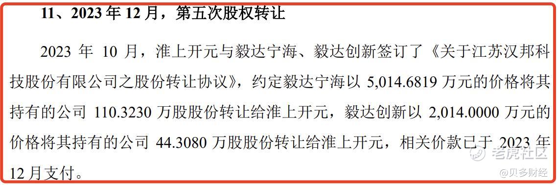 2022年9月,淮安集鑫、淮安集礼分别斥资1389.4044万元和1073.5856万元参与了对汉邦科技的增资。但在这个过程中,也有股东减持。2023年3月,药明康德新药以5000万元的价格其持有的汉邦科技91.6667万股股份转让给华金领越。