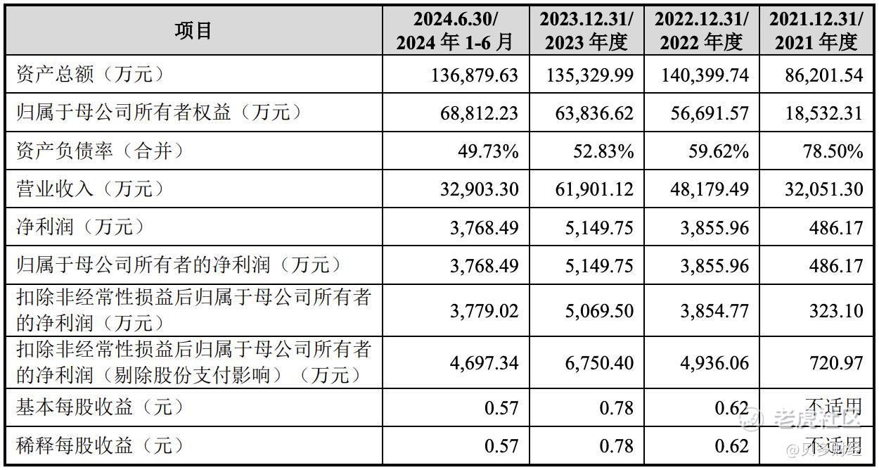 2021年、2022年、2023年度和2024年上半年(下同“报告期”),汉邦科技的营收分别约为3.21亿元、4.82亿元、6.19亿元和3.29亿元,净利润分别约为486.17万元、3855.96万元、5149.75万元和3768.49万元。