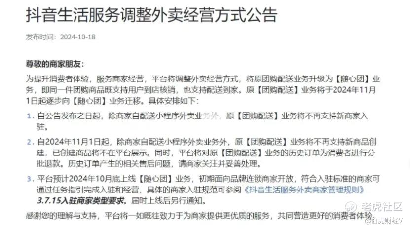 但在去年11月,抖音却宣布官方外卖新进业务全部停止,原“团购配送”业务将逐步向“随心团”业务迁移,这次调整也被视为抖音对外卖业务的“战略性放手”。