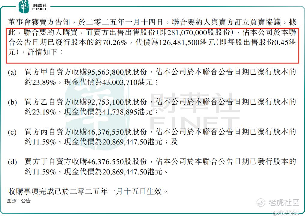 1月20日,港亚控股发布公告称,联合要约人210K Capital, LP、Sora Valkyrie Limited、Top Legend SPC及恒达投资有限公司联合向公司董事会主席兼执行董事萧木龙先生收购了合共约2.81亿股股份,占公司已发行股本的约70.26%。买卖协议项下对价为约1.26亿港元,相当于每股出售股份0.45港元。