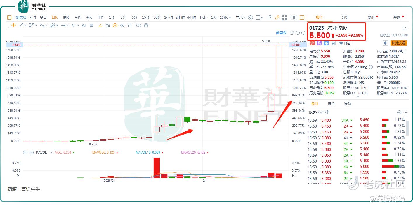 其中,港亚控股在2月17日跳空疯涨92.98%,引发广泛关注。而如果从1月21日算起至2月17日,港亚控股的股价更是累涨逾10倍,堪称是近期的超级妖股。
