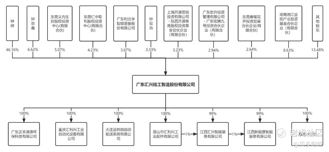 据招股书披露,钟辉为汇兴智造董事长、总经理,也是该公司实际控制人。本次上市前,钟辉直接持有汇兴智造46.16%的股权。同时,通过一致行动人——钟世鑫、钟双燕及春暖花开投资发展企业控制12.59%的股权,合计12.59%。