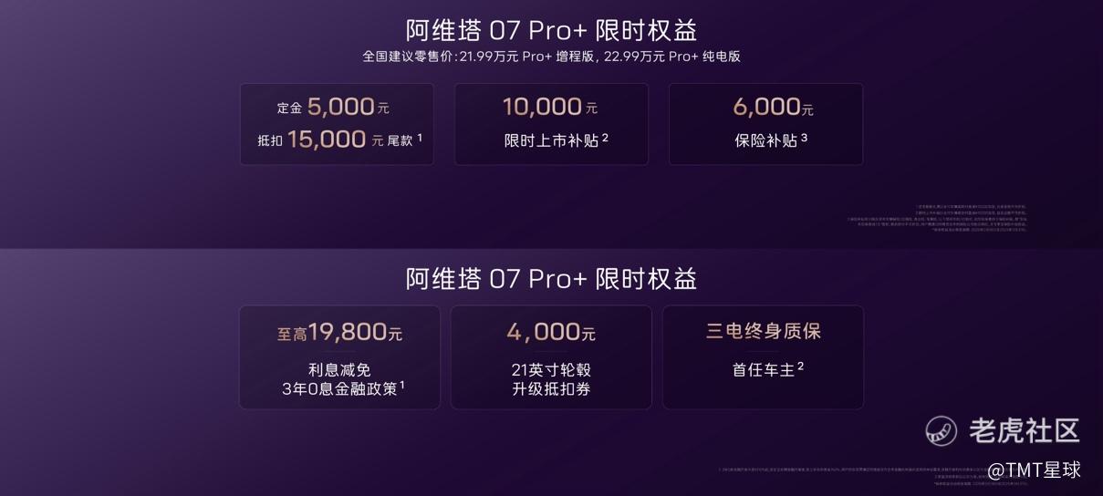 与此同时,针对本次阿维塔07 Pro+的上市,阿维塔还推出了重磅购车礼遇,即日起至2025年3月31日,下定用户可享六大限时权益:支付5,000元定金抵扣15,000元尾款、10,000元限时上市补贴、价值6,000元的保险补贴、至高19,800元的3年0息金融政策、价值4,000元的21英寸轮毂升级抵扣券、首任车主三电终身质保。