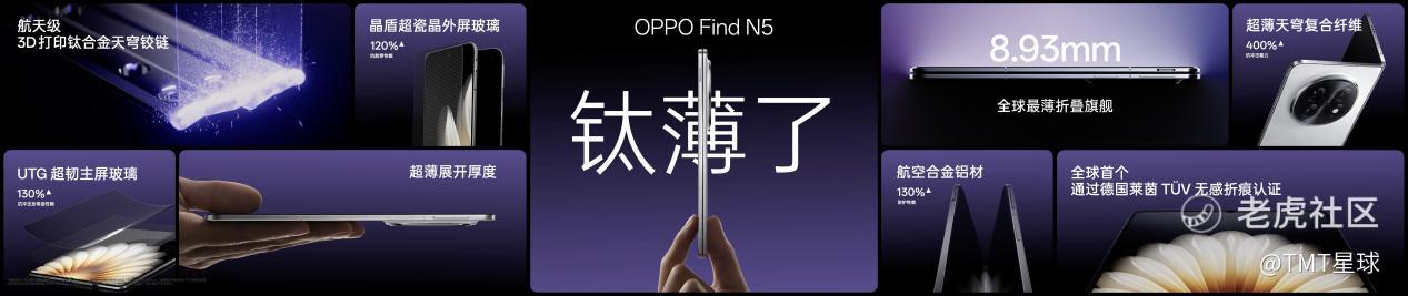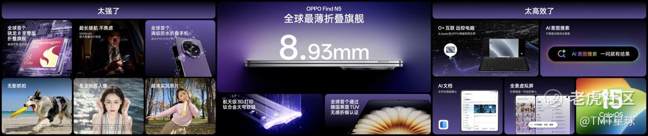 OPPO 首席产品官刘作虎表示:“一直以来,OPPO Find N系列用独创性的结构设计与的突破性的材料创新,持续引领折叠行业。Find N5 以航天级的钛合金 3D 打印技术,引领折叠旗舰进入 8 毫米时代。作为 8.93mm 全球最薄折叠旗舰,Find N5不仅钛薄了,更具备极致性能、极致续航、极致影像、满级防水,太强了!搭载 ColorOS15 的Find N5 还支持远控 Mac 电脑,AI 意图搜索,还有更好用的全景虚拟屏,太高效了!”