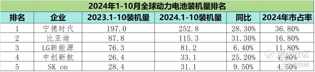 2024年前10个月全球动力电池装机量排名 由电池工业网信息整理