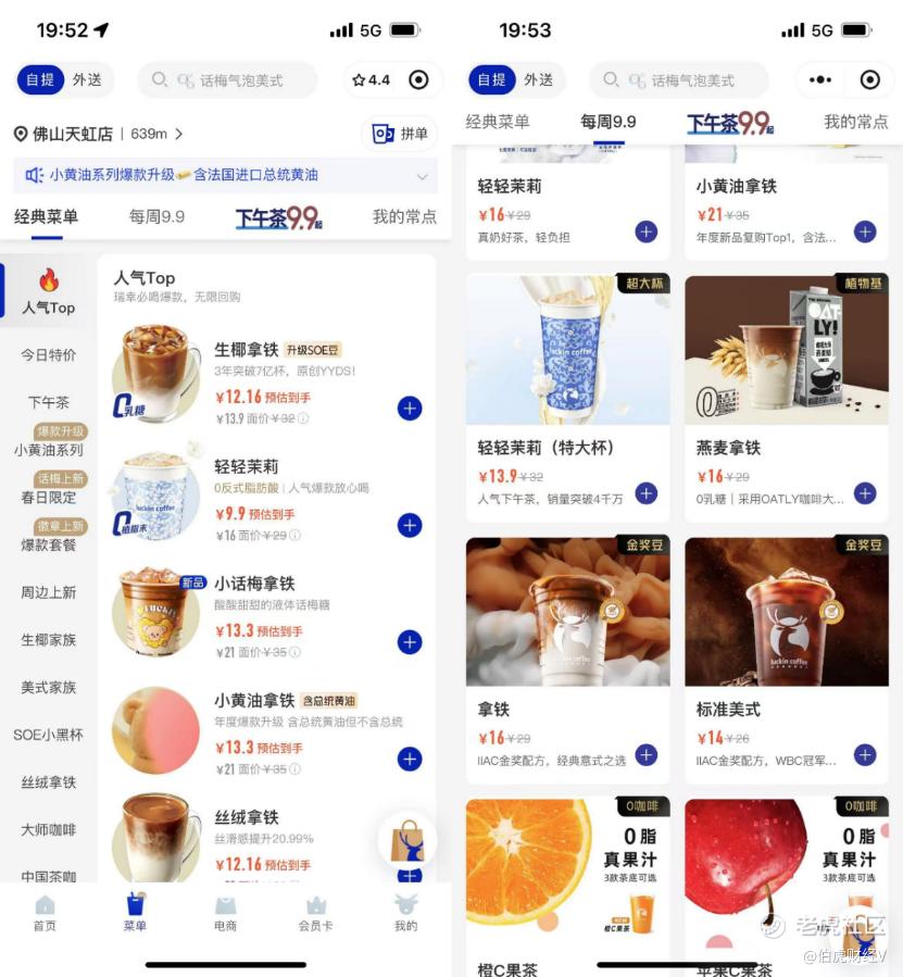 今年,瑞幸更是直接涨价,原本标价29元的产品目前标价32元,涨价幅度在3元/杯左右;9.9元饮品区,也仅剩3款咖啡可选,大部分经典产品的实际价格都在12.9元左右。
