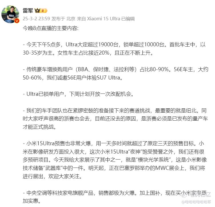 Ultra大定超过19000台,锁单超过10000台,首批车主中,以30-35岁为主,女性车主占比接近20%,且正在不断上升