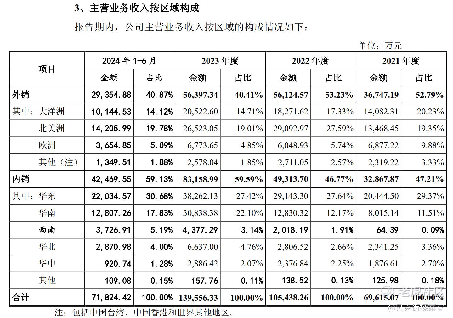 结合招股书可知,2022年、2023年,随着公司加大国内市场的开拓力度,以及部分海外市场的增长,公司内销收入、外销收入分别较上年增长了50.04%、52.73%和68.63%、0.49%,从而使公司整体销售规模增加。但是主营业务外销金额从36,747.19万元降至29,354.88万元,占比也从52.79%降至40.87%。第一轮问询函中,交易所也注意到报告期内,恒鑫生活以外销为主,各期境外销售金额占主营业务收入比例分别为78.88%、70.79%、52.79%。