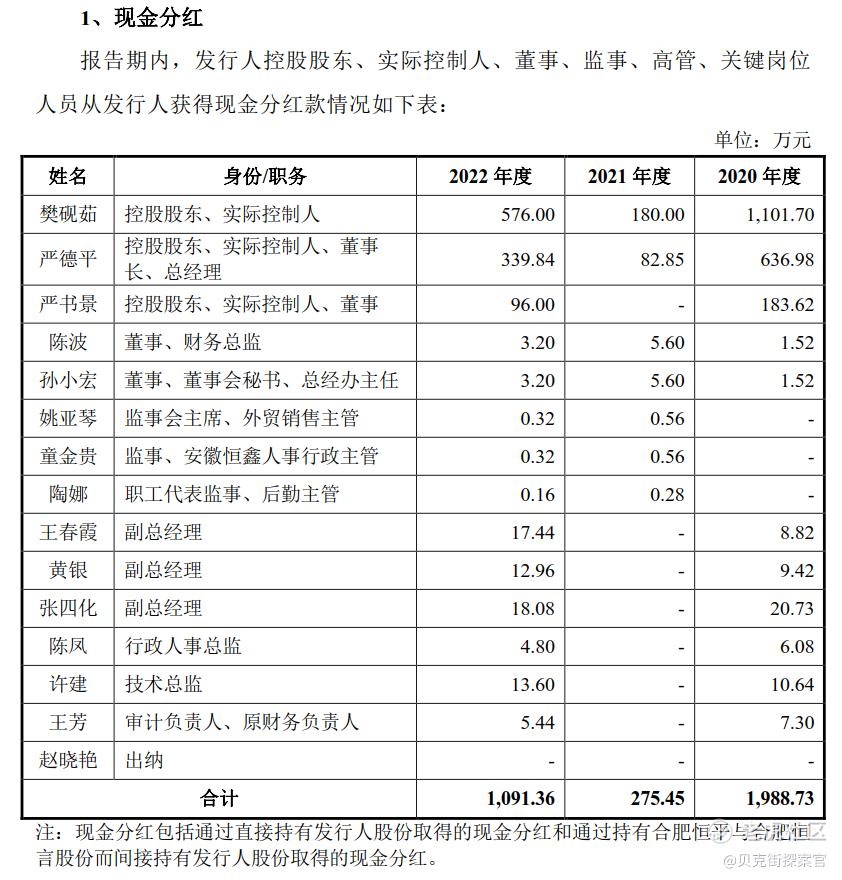 恒鑫生活在第一轮问询函回复中,提供了恒鑫生活控股股东、实际控制人、董事、监事、高管、关键岗位人员从恒鑫生活获得现金分红款情况。