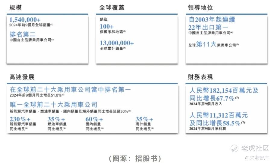 按招股书中弗若斯特沙利文的资料显示,以截至2024年9月30日止九个月的全球销量计算,奇瑞是中国第二大自主品牌乘用车公司和全球第十一大乘用车公司,前九个月全球销量共为154万辆。而2024年奇瑞全年销量累计突破260万辆,最后一个季度贡献了超百万辆的业绩,令奇瑞继续稳坐全年世界第十一大车企的宝座。2024年前三季度,奇瑞汽车在中国的乘用车销量较2023年同期增长61.9%,而新能源汽车销量较2023年同期增长246.5%。报告期内,奇瑞汽车全球销量同比增长51.8%,增速位居全球前二十大乘用车集团之首,在中国前十大乘用车公司中排名第一。