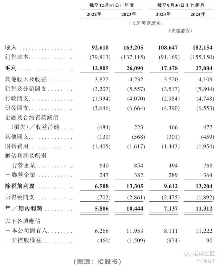 财务数据绝对是本次招股书中的另一大亮点。招股书显示,2022、2023年及2024年1至9月,奇瑞汽车营收分别为926.18亿元、1632.05亿元及1821.54亿元;利润分别为62.66亿元、119.53亿元及112.22亿,其中2024年1-9月净利润同比增长58.5%。