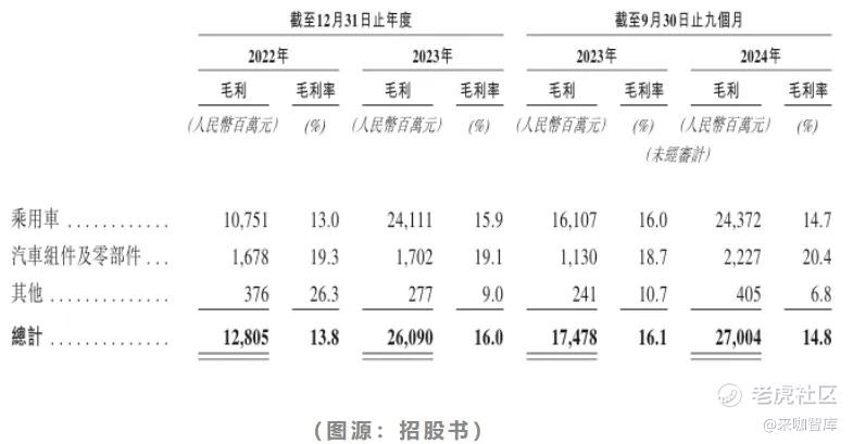 2022年、2023年和2024年1-9月,奇瑞汽车总的毛利分别为128.05亿元、260.9亿元以及270.04亿元;其中乘用车的毛利分别为107.51亿元、241.11亿元,以及243.72亿元,毛利率分别为13%、15.9%以及14.7%,并且可以以此推断出2024年前九个月奇瑞汽车单车毛利在1.6万元左右。