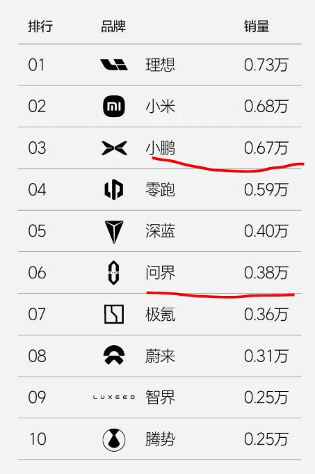 这次最大的不同是理想超过小鹏成为第一,小鹏跌倒第三了,小米单凭一款车就第二名了。小米甚至应当是超过了问界+智界,只是产能限制。