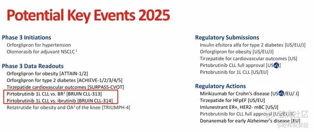 在礼来2024Q4的业绩会上,管理层宣布了公司2025年重大读出数据事件的指引,其中便有Pirtobrutinib的两项三期研究BRUIN CLL-313、BRUIN CLL-314的数据读出。