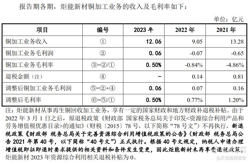 而且公司给出了炬能新材铜加工业务毛利率为负从事该业务的原因并认为具有合理性,2021-2022年,炬能新材铜加工业务毛利率为负,但考虑相关国家财政和地方财政退税补贴后,炬能新材铜加工业务调整后的毛利率为正。2022年3月1日之后78号文不再执行,此后炬能新材采购的再生铜均取得了增值税专用发票,从而炬能新材2023年的毛利率转正。因此,炬能新材未亏损从事铜加工业务向公司供货,具有商业合理性,其他问题江南新材在回复函中也给出详细答复。