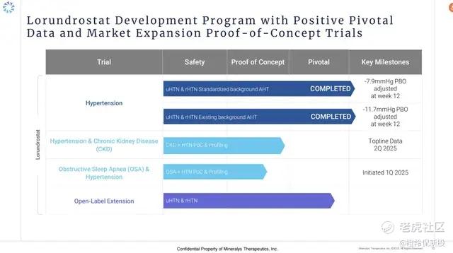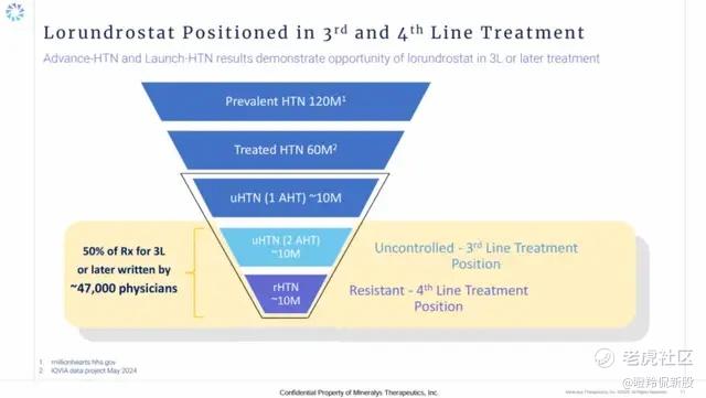 结语:纵观难治性高血压的已商业化、后期临床创新管线,不仅可以发现这个领域存在较大的未满足临床需求,同时未来几年内马上会有更佳效果和安全性的迭代药物即将上市,这显然会打开赛道的市场空间。从中短期的进度来看,Lorundrostat的三期成功使得Mineralys在与阿斯利康的竞争中占得先机,同时我们也看好未来其获批在欧美的放量进程,更期待有国产创新药物加入战团。 $信立泰(002294)$ $Mineralys Therapeutics, Inc.(MLYS)$ $阿尔尼拉姆制药公司(ALNY)$