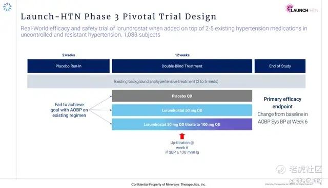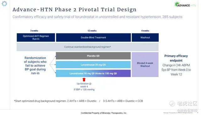 Advance-HTN这项关键二期更像是为Lorundrostat验证疗效排除干扰性的因素,其设置了一个优化治疗背景:采用两种降压药物治疗患者以及3-5种降压药患者在入组筛选前需要停用现有药物并采取标准治疗方案治疗(具体可详见前文欧洲高血压联合用药流程图),入组患者分别分配到安慰机组、Lorundrostat 50mg每日一次组、Lorundrostat 50mg每日一次并在第4周可根据预定义标准调整至100mg组。该研究的主要终点为24小时动态血压监测(ABPM)评估的收缩压变化,治疗12周后相比安慰剂的平均降低值。