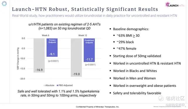 Lorundrostat这两项关键临床,足以证明其在未控制、难治性高血压患者带来极高的临床益处,显然其将成为三线、四线高血压患者的治疗选择,按Mineralys公司口径其辐射的患者至少在2000万人。