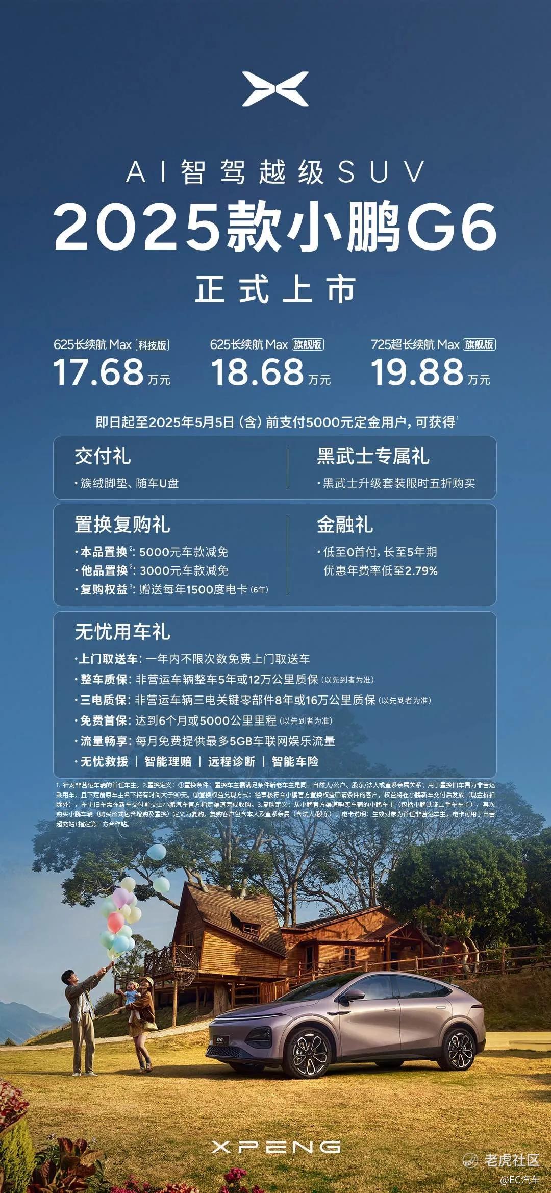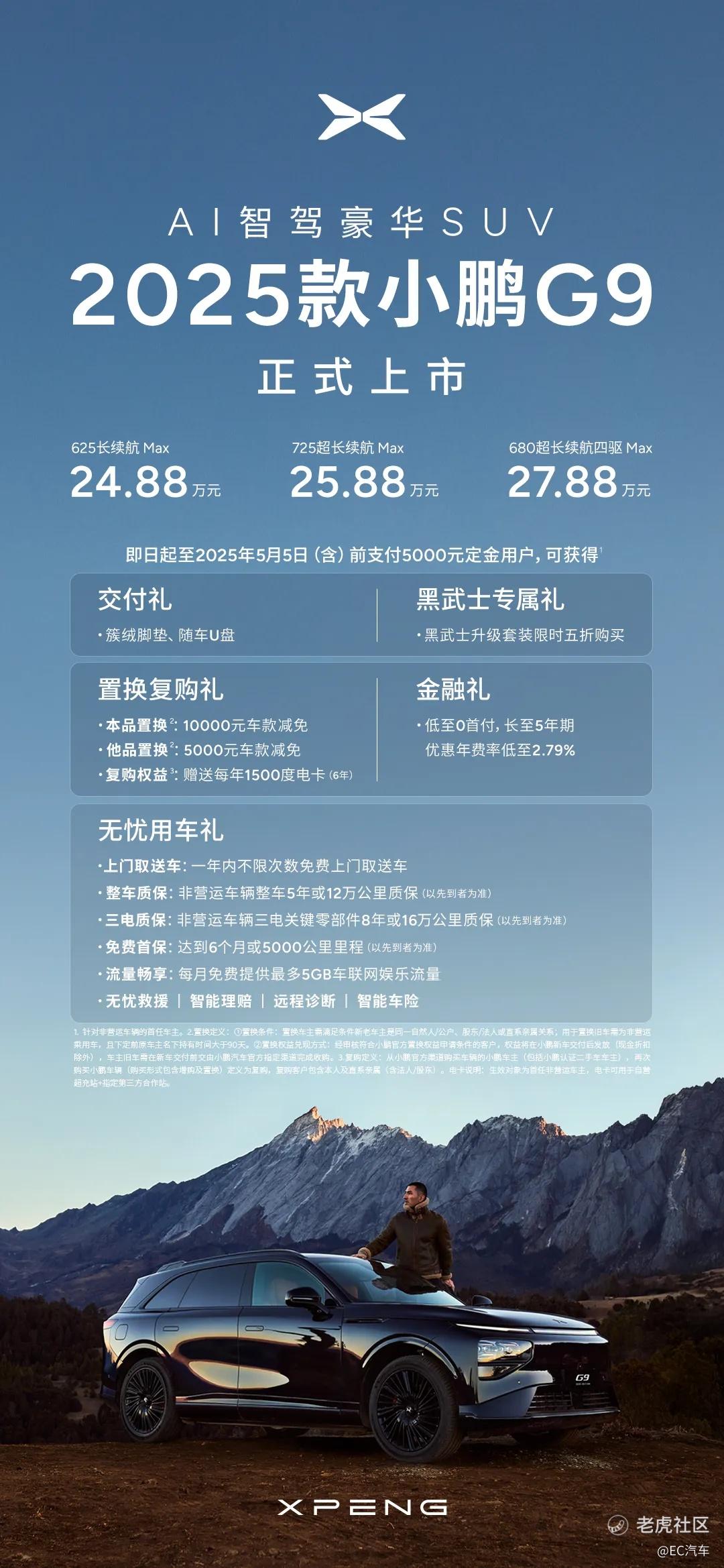 最终2025款小鹏G6三个版本(长续航 Max 科技版、长续航 Max 旗舰版和超长续航 Max 旗舰版),官方指导价分别为17.68万元、18.68万元和19.88万元。2025款小鹏G9三个版本(长续航 Max、超长续航 Max和超长续航四驱Max),官方指导价分别为24.88万元、25.88万元和27.88万元。