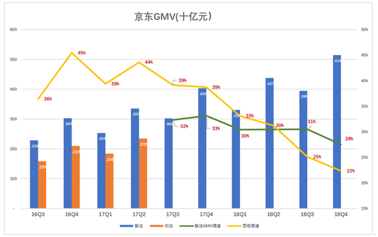 京东对GMV的重视自不待言,在2016年GMV同比增速仅47.4%、2017年预期不妙的形势下,京东“悍然”更改了GMV计算口径,从2017年Q3开始披露“新版GMV”并停止披露GMV构成(截至2017年Q2,第三方卖家贡献的GMV占比为42%)。