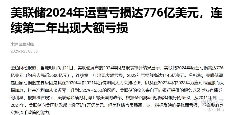 这个新闻有点吓到我了,美联储意外“爆雷”,亏了776亿美元! 这么惨的吗,一年亏这么多,吃钱也吃不了这么多的吧。美联储官员强调,该项指标不影响美联储货币政策实施。该亏损源于美联储在本轮加息周期期间,向各大金融机构支付的利息。为了将短期利率维持在目标水平,美联储需要向银行和货币基金支付保证金存放在中央银行的补偿。这种利率管理的成本已经超过了美联储持有债券所产生的利息收入。