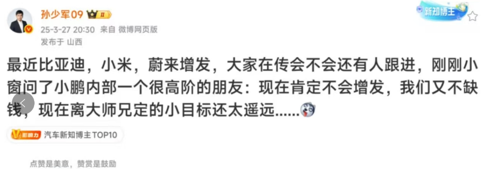 通过孙少军的嘴说出来不会融资,孙少军一直和小鹏关系不错,自己也买了小鹏的车。