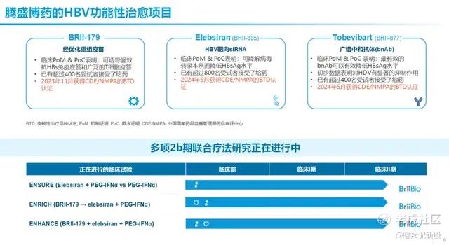 腾盛博药还启动了另一项2b期临床ENHANCE研究来评估BRII-179,elebsiran和长效干扰素三联给药和长效干扰素单药对照的效果。此前的数据显示,与长效干扰素单药相比,在长效干扰素基础上联用elebsiran或BRII-179都可以增加乙肝表面抗原清除率。这项研究主要是为了确认这种疗效是否可以互相叠加,从而最大限度地提高功能性治愈率。ENHANCE研究已于今年1月完成入组。