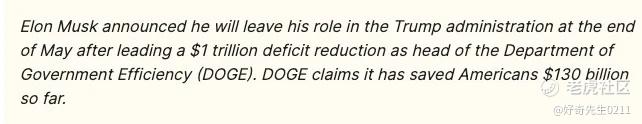 近日,马斯克透露,计划5月底辞去美国政府效率部的职务。