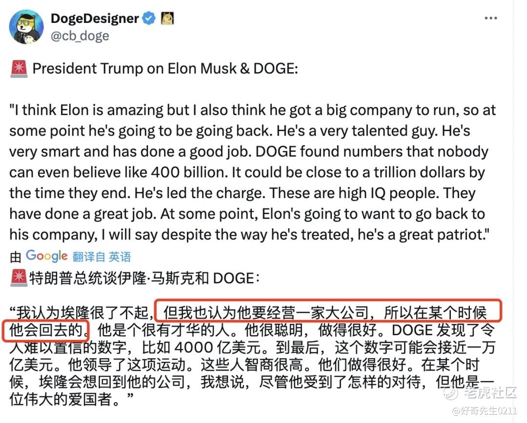 别看马斯克把白宫搅得天翻地覆,特朗普倒是特别吃他这套。公开表示:"这哥们儿牛啊,可惜他得回去管公司了。"