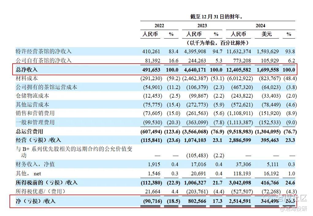 作为黑马选手,霸王茶姬这两年的业绩也非常亮眼,增速颇高。《招股说明书》显示,2022-2024年底(以下简称:报告期),霸王茶姬的营收分别为4.92亿元、46.40亿元和124.06亿元,年复合增长率超过400%,同期对应的净利润分别为-1.45亿元、7.25亿元和23.84亿元。报告期内营收增长近25倍,同时最新的净利润率高达20.3%,为行业最高。
