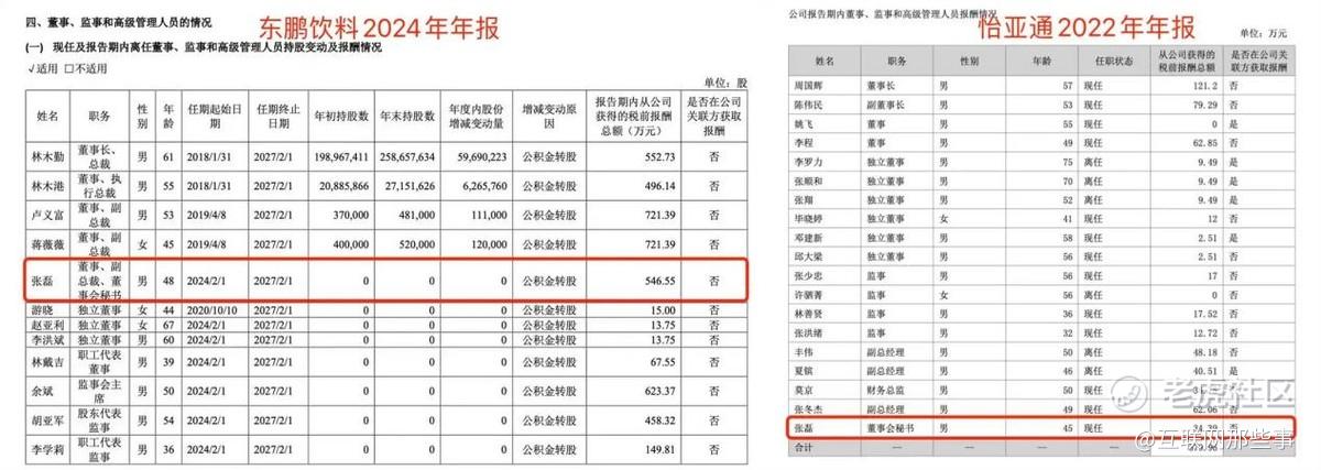 加盟东鹏饮料之前,张磊的最近一份工作是在怡亚通担任董事会秘书(2022年1月-2023年7月),财报显示其2022年度薪酬为34.39万(税前),不足其在东鹏饮料财报中显示的546.55万薪酬的零头。