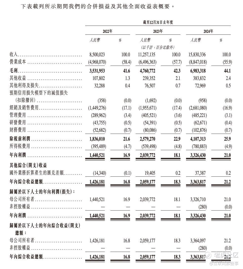 2022年~2024年,东鹏饮料分别录得营收85亿元、112.57亿元、158.30亿元,分别实现利润14.41亿元、20.4亿元、33.26亿元,净利润率分别为16.9%、18.1%、21%;
