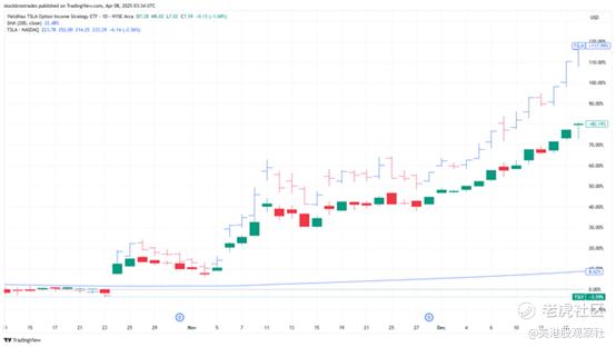 期权出售产生的额外收益不足以抵消下行风险,尤其是相对于其在上涨过程中限制的上涨空间而言。下图是 TSLY 与特斯拉在 2024 年 10 月 11 日至 2024 年 12 月 17 日上涨期间的走势图。特斯拉 的回报率为 117.99%,而 TSLY 的回报率为 80.19%。
