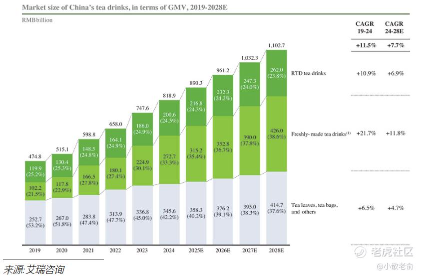 中国的茶饮料市场在过去经历了持续的增长。根据艾瑞咨询的数据,中国茶饮料市场的GMV将从2019年的4748亿元人民币增长到2024年的8189亿元人民币,预计到2028年将达11027亿元人民币,这意味着从2024年到2028年的复合年增长率为7.7%。新茶饮市场的市场规模按GMV计算,从2019年的1022亿元人民币增长到2024年的2727亿元人民币,复合年增长率为21.7%,超过了整体茶饮料市场中的其他细分市场。到2028年,中国新茶饮市场的规模预计将达到4260亿元人民币,从2024年到2028年的复合年增长率为11.8%。