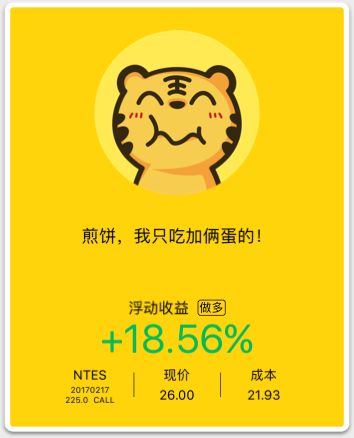 16年本来盈利了80%,结果在网易270块的时候全仓购买期权,结果可想而知...17年经过一个月的奋斗慢慢回本了,信心逐渐爆棚